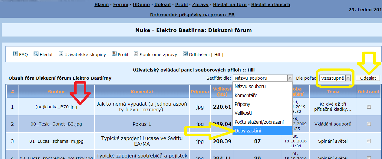 Úplně na konci výpisu profilu je odkaz Uživatelský ovládací panel souborových příloh, objeví se seznam, jaký je na obrázku, v něm si vybereš Třídit podle Data zaslání, vzestupně a klikneš na Setřídit.