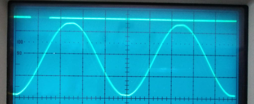 První orientační měření, vzhledem k malému chladiči jsem použil zátěž 8,2Ω. Dále 36V ze stabilizovaného zdroje, 1 kHz, 10V/dílek, měřeno před výstupním kondenzátorem a bez zapojené modulace proudového zdroje.