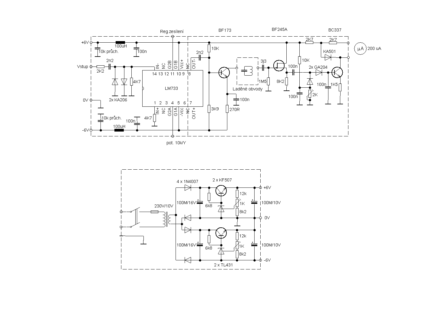 Dostal se mi do rukou absorpční vlnoměr staré řady BM217. Tento přístroj je v originále osazen bateriovou pentodou 1L33 a potřebuje žhavící monočlánek a anodovou baterii 45V. Pokus o standardní restauraci přístroje ztroskotal, protože po jeho otevření jsem zjistil, že elektronická část je celá "vykuchaná". Zůstaly jen laděné obvody - naštěstí nepoškozené. Původní dokumentaci se schématem jsem nesehnal a tak byl do přístroje vestavěn nový zesilovač. Použity jsou výhradně šuplíkové zásoby v intencích této rubriky. Pro regulaci zesílení je použit potenciometr 10k/Y (tzv. exponenciální). Ke svorkám pro regulaci zesílení se připojí jezdec a ten konec dráhy, u kterého odpor narůstá pomalu. Je možno použít i 10k/G (logaritmický), ale zesílení se bude zvětšovat při otáčení doleva. Diodový detektor je podepřen malým napětím, které se nastaví tak, aby bez signálu tekl měřidlem proud asi 3 µA. Jelikož laděné obvody nelze z prostorových důvodů stínit, je třeba stínit vlastní zesilovač a přívod k němu od vstupu. Stíněním je i rozdělen prostor uvnitř stínící krabičky.
