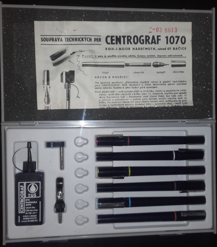 Já jsem se učil ještě vytahování čar pomocí svěrnejch pérek, kde se dala šířka čáry ještě nastavit přímo šroubovacím kolečkem s vyraženýma čísílkama ... Pár fotek, ty pérka jsou na fotce vlevo dole v rudým "plyši" ...