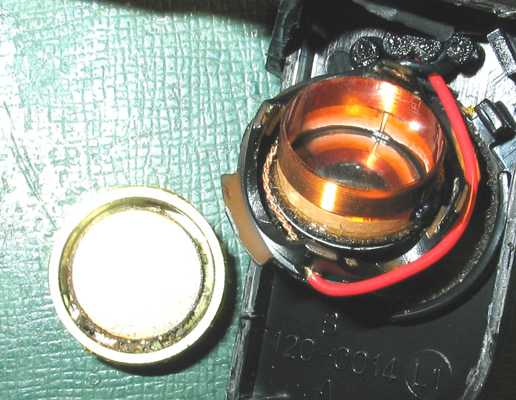 Takze treba odlepit ten strieborny stred a odstranit zvysky zavesu. Nalepit magnet, potom cievku vystredit (papierom), nalepit novy zaves (z coho to vyrobit?), papier odstranit a nalepit stred naspat.
