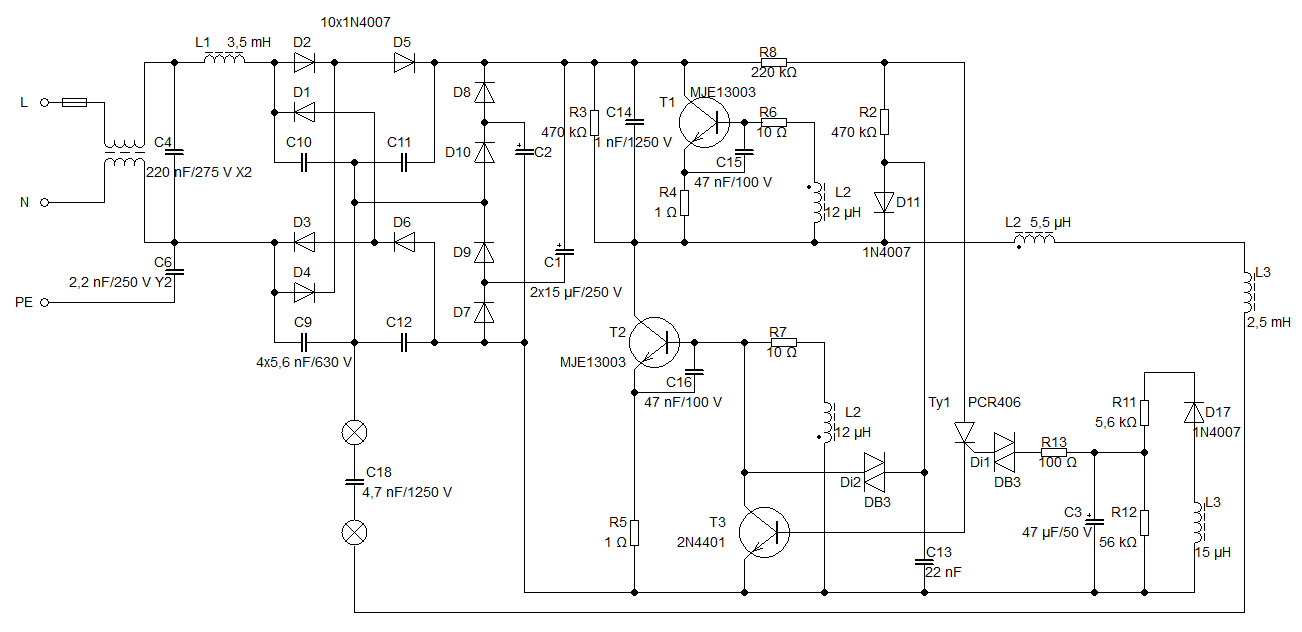 Brácha mi donesl na opravu zářivkový světlo s elektronickým předřadníkem. Obkreslil jsem z toho schéma, ale stejně nechápu, jak to má fungovat. Vadný byly zatím T1, T2 a R6. Všechno ostatní se zdá v pořádku, něco změřeno na desce, něco venku. Nicméně stále nesvítí. Budu pátrat dál, ale kdyby toto konkrétní někdo znal, budu rád za radu.