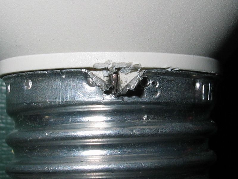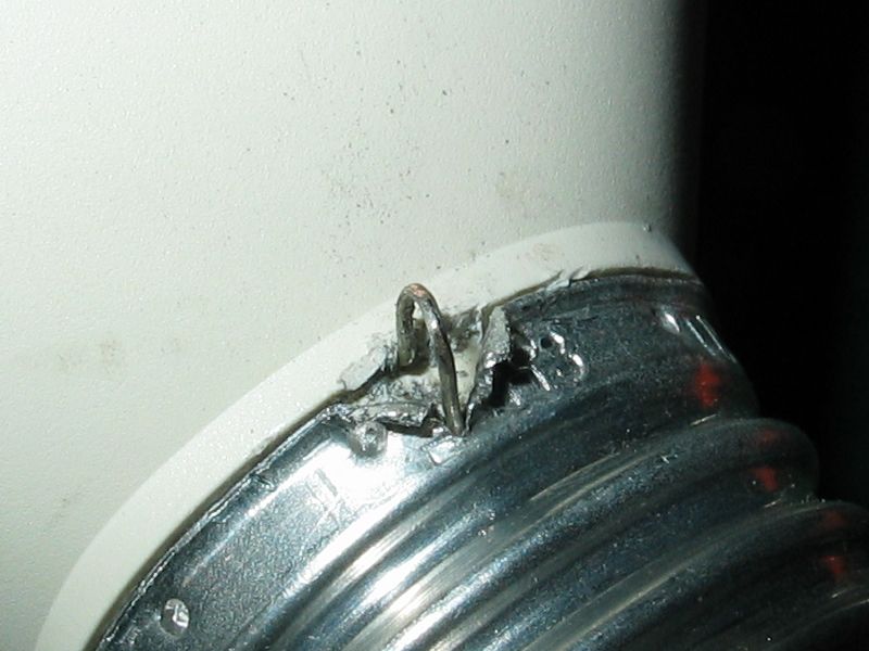 Spominana 24W usporka OSRAM zase zacala poblikavat a rovnako aj dalsia Philips. Hlinikovu objimku som v mieste zalisu privodneho drotu (pozna sa to tak, ze je tam mierny hrbol) odchlipil od plastoveho tela lamacim nozom a nasledne skrutkovacom. Hlinik sa roztrhol, co ale nie je na skodu. Pinzetou som kusok drotu vytiahol spod objimky, pritlacil medzi roztrhnute casti a nasledne ohol naplocho.