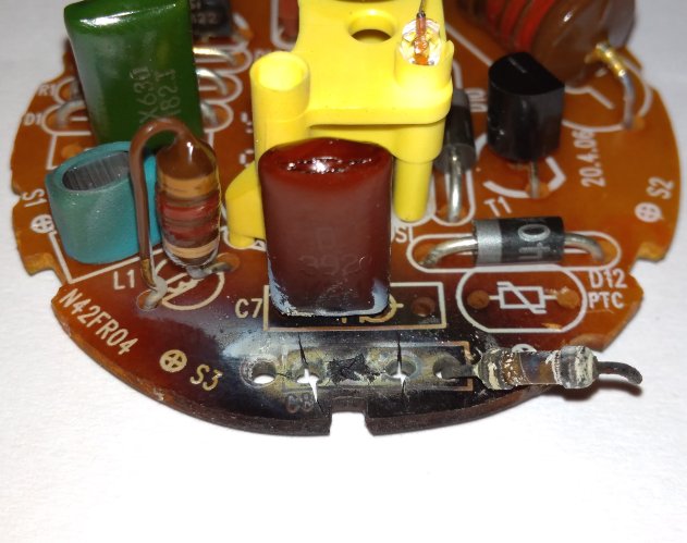 Po rozpolení bolo vidno opálený plošák. Medzi vláknami je zapojený kondenzátor 3n9 v sérii s rezistorom. Kondenzátor samozrejme prerazený, následne cez rezistor tiekol väčší prúd, čo ho rozpálilo tak, až zuhoľnatela DPS. Rezistor som premeral, má niečo cez 29Ω. Bohužiaľ tam nie je osadený termistor, ako som očakával. Z inej dosky som vybral kondenzátor 2n7/1200V a osadil ho podľa klasického zapojenia. Do "čudlíku" na spodku pätice ešte navŕtať dierku a prispájkovať prívodný káblik k plošáku a už svieti
