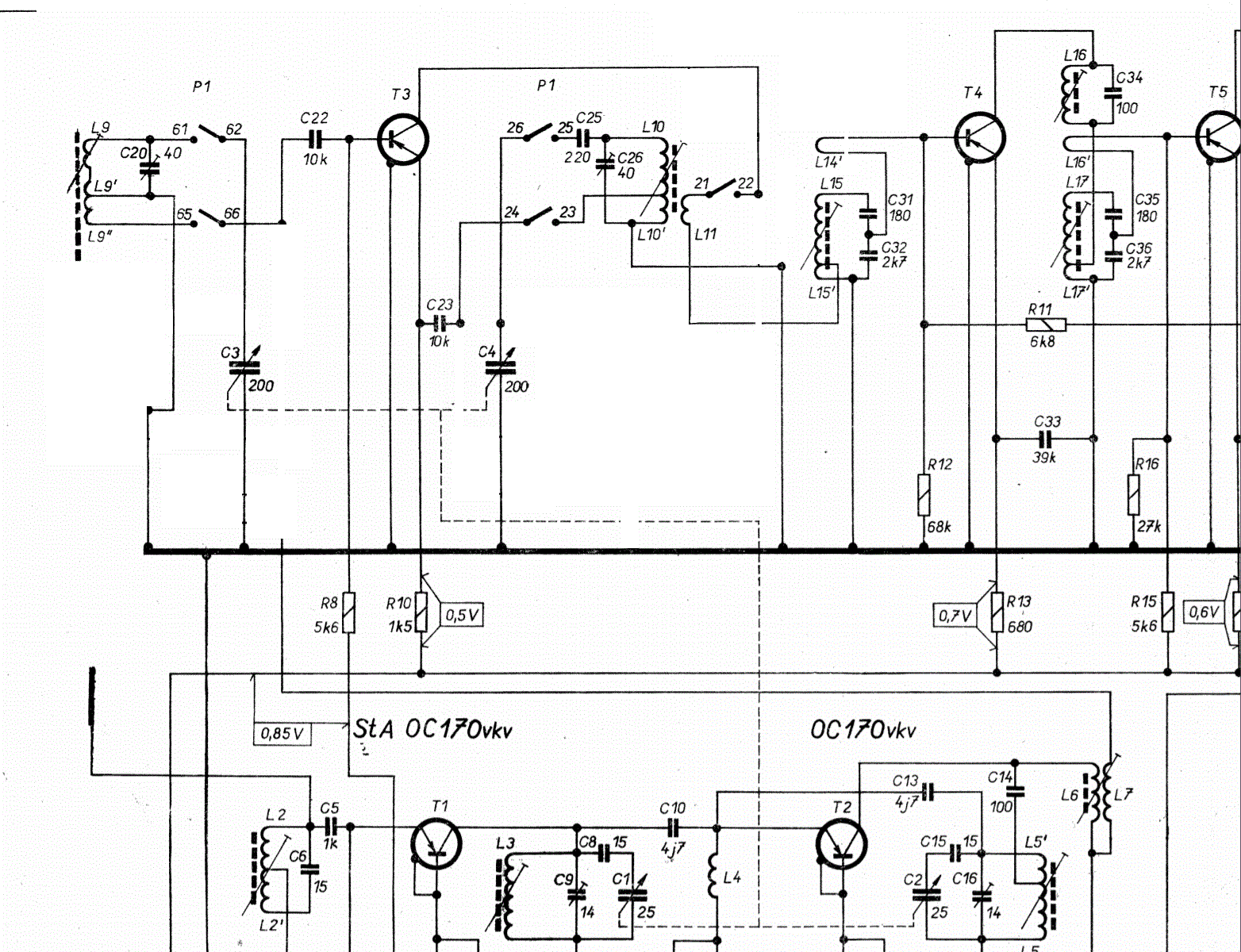 Vinutí L11, L12, L15 vf transformátorů jsou OK (DC měření vůči GND). Úbytek na R10 je 0,95V místo 0,5V ale to bude tím nekmitáním.
