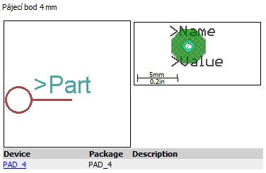 Vypadá to složitě, ale jakmile to pochopíš, můžeš si nakreslit do knihovny např. "novou součástku", která má PACKAGE s jedním PADem a nějaký primitivní SYMBOL.