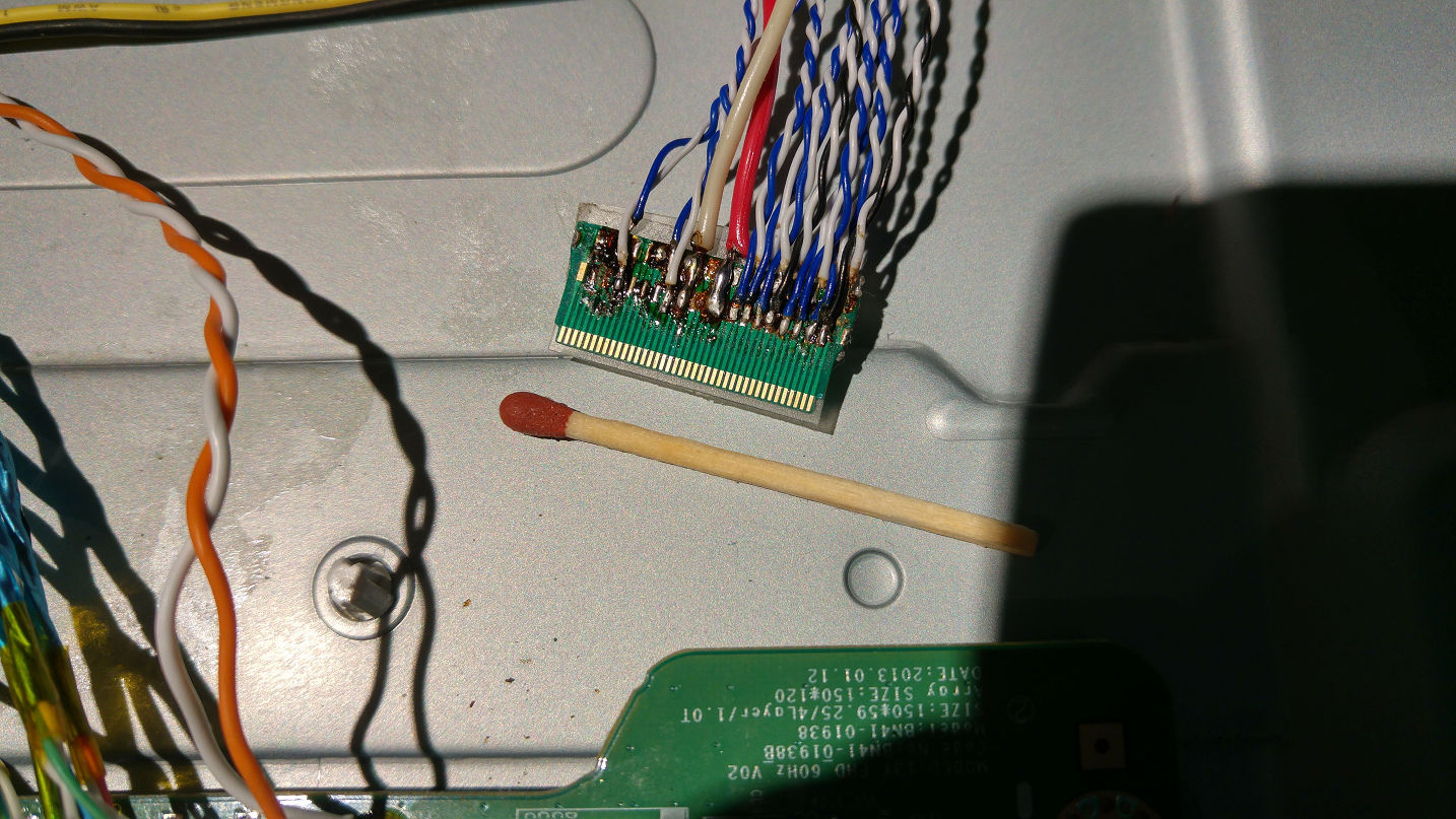 Tak to mám hotové. Nejvíc práce bylo s drátováním. 51-pin konektor do TV jsem nesehnal vůbec, takže jsem kroucené páry připrasil přímo na T-con desku. 40-pin konektor do základní desky jsem koupil tenhle, který ovšem úplně nepasuje, shodná je jen rozteč kontaktů (vražedných 0,5mm), ale vnější šířka, hloubka zasunutí, ani tloušťka nesedí. Musel jsem amputovat kovovou část, strany obrousit a zespoda navíc přidat fólii o tloušťce cca 0,7mm, která přesahuje přes okraj a zároveň tak tvoří doraz proti příliš hlubokému zasunutí.