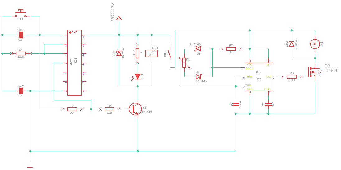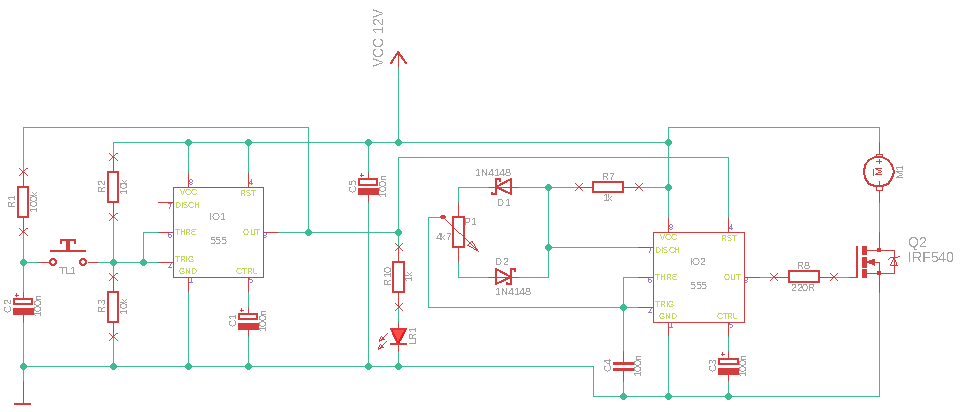 Zkusil jsem z pinu 5 u obou 555 dat elektrolyt 0.1uF na zem a pak dat jeste 0.1uF elektrolyt z napájení na zem. Při sepnutí se motorek na chvíli zapne, asi tak na 0.5s a hned se zas vypne. Ledka na první spínací 555, taky jen problikne. Zkusil jsem oddělat diodu mezi +/- motorku, elektrolyt mezi napájením a zemí a obvod začal zapínat/vypínat správně. Regulace taky šla, ale dost se snížila regulační schopnost. Z potenciometru, kterej má 4.7k, tak regulace funguje cca na první čtvrtině a to ke konci té čtvrtiny začal dost pískat a na zbytku motorek už ani netočí. Aktuální zapojení je na obrázku.