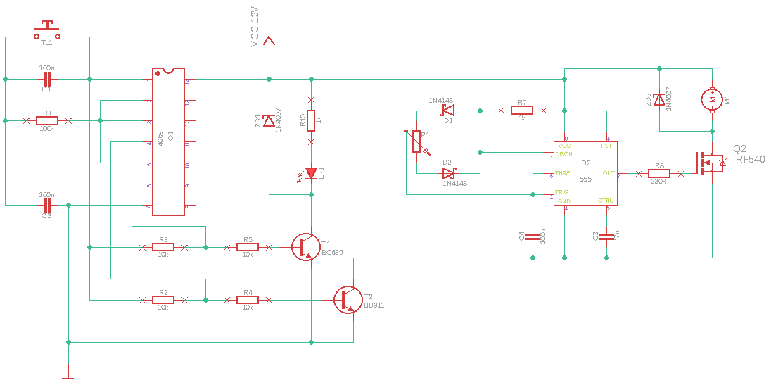 Našel jsem si zde obvod pro zapínání/vypinání pomocí 4069. Pro PWM regulaci jsem si našel obvod pomocí časovače 555. Vznikl mi z toho obvod na obrázku 1.