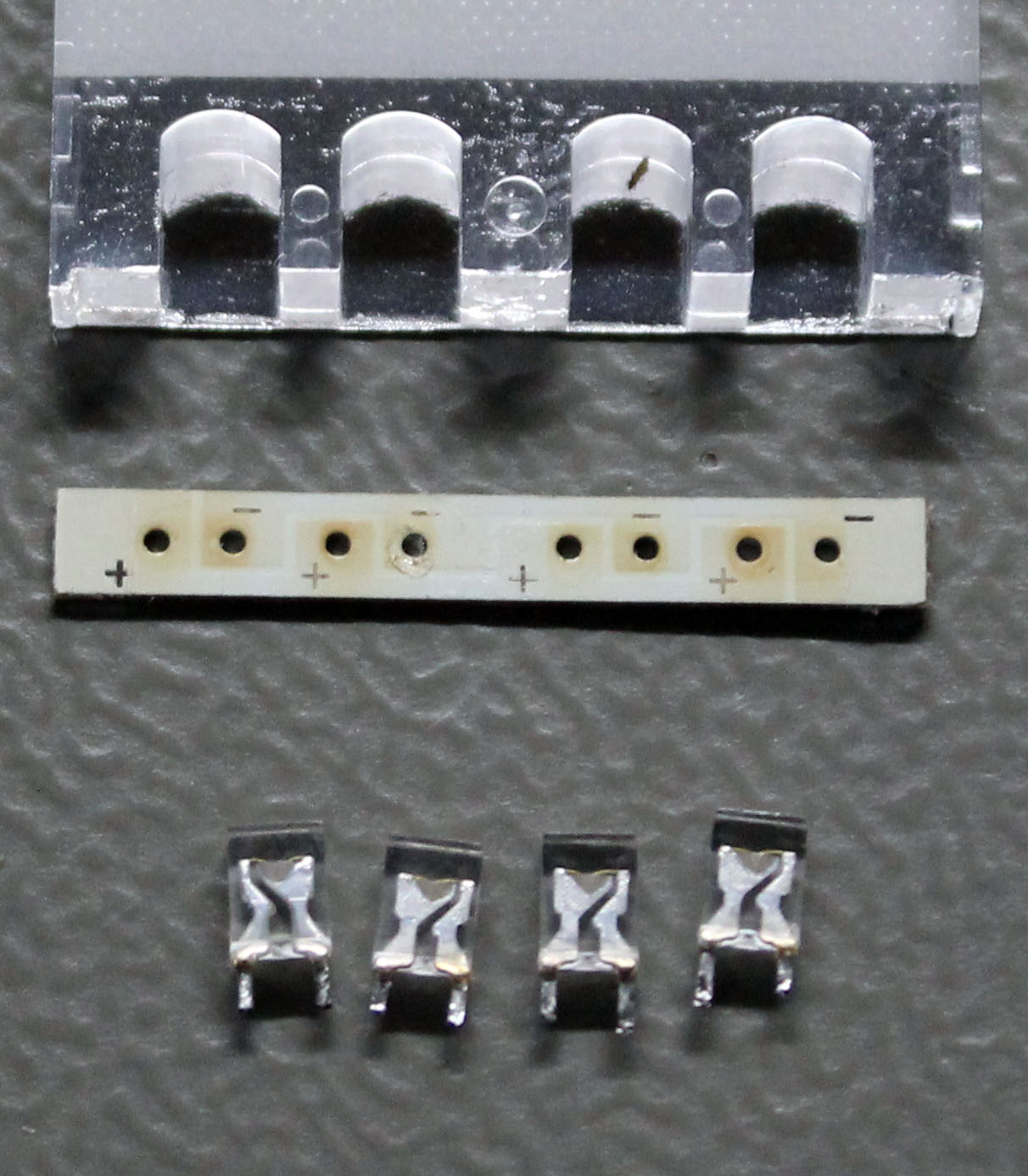 Tak jsem použil trochu víc násilí a ukázalo se, že to pod fólií není zastříknuto, jen nalepeno na malým tišťáku. Oproti předpokladům jsou všechny LED paralelně, přitom při měření zapájenýho modulku jsem nenaměřil žádnej úbytek ani při 10 V. Dvě z nich svítí normálně a dvě skoro vůbec (na 1 mA). Není mi jasný, proč tam teda cpou přes 19 V, když jsou třeba tak 3,5 V a 5 V mají k dispozici. Italové....
