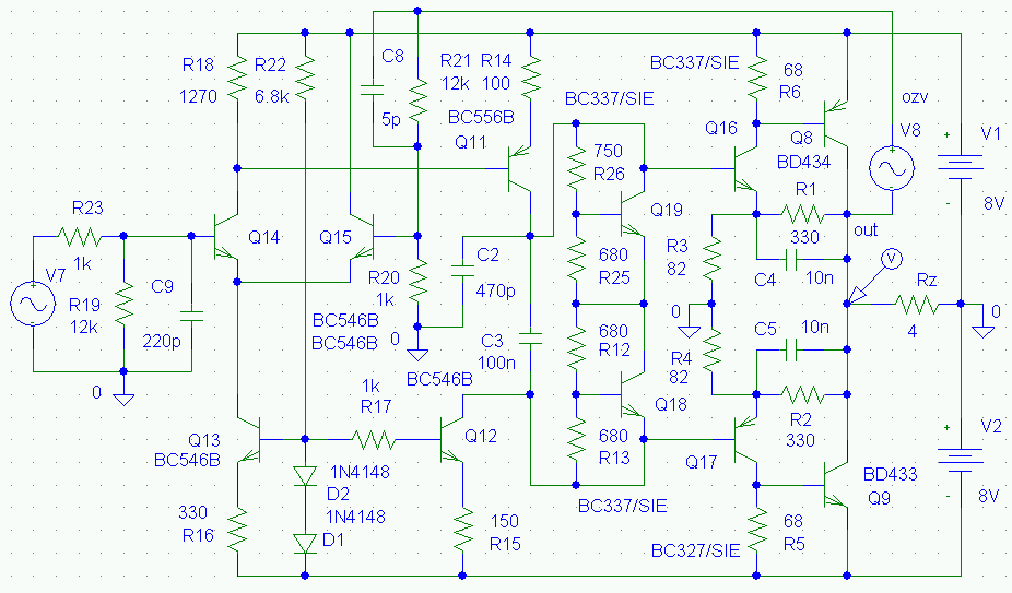 Na první pohled se zdá, že stačí Q16,17,18,19 a koncové tranzistory z toho lze vynechat.