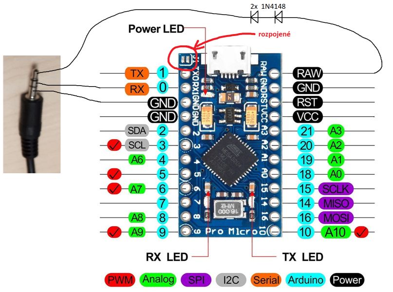 Doplnenie: Ak bude klávesnica pripojená zároveň k tlačiarni, tak napájanie bude mať zrejme z nej a teda ten vodič s dvoma diódami z pinu RAW na špičku konektora možno vynechať. K Arduinu tak pôjdu len dva vodiče.