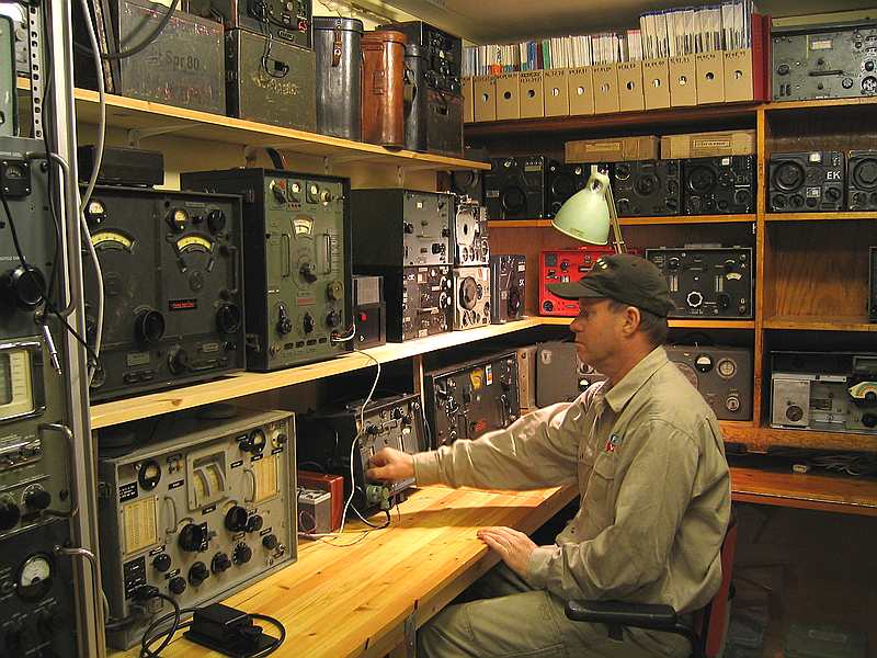 Za lampou jsou části letecké radiostanice FuG.10, zleva vysílače SK, vpravo přijímače EK.