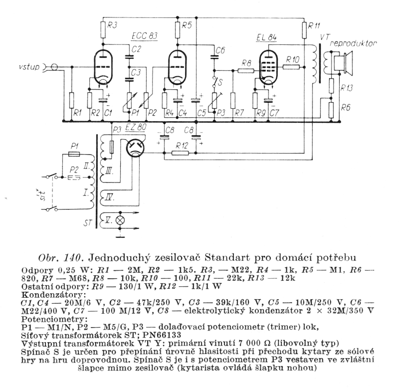 Ve snaze poskytnout čtenářům jednodušší návod na stavbu zesilovače uvádíme na obr. 140 skutečně nenáročný elektronkový zesilovač. Toto zapojení má posloužit těm, kteří ještě nepronikli do tajů tranzistorové techniky natolik, aby si dostatečně rychle a levně dokázali pořídit něco, co by jim posloužilo jednak jako zkušební králík a jednak jako odrazový můstek k přechodu na stavbu jakostnějšího zařízení. Zapojení podle obr. 140 dává výkon asi 4 až 5 W. Postačí tedy pro domácí přehrávky nebo pro první zkoušky rodícího se hudebního souboru (jde o zapojení továrně vyráběného zesilovače Standard).“