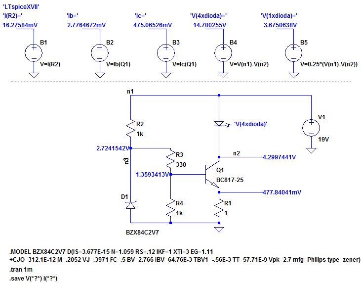 Pokouším se podchytit teorii stejnosměrných obvodů a proto se snažím při výrobě UV osvětlovací jednotky navrhnout jednoduchý obvod konstantního zdroje pro 4 UV led diody. Našel jsem zapojení s bipolárním tranzistorem a tak jsem se pustil do analýzy tohoto obvodu abych pochopil jak to funguje a mohl navrhnout vlastní obvod (resp. zvolit hodnoty pro moji aplikaci). Prosil bych osvětlení některých nejasností a kontrolu postupu.