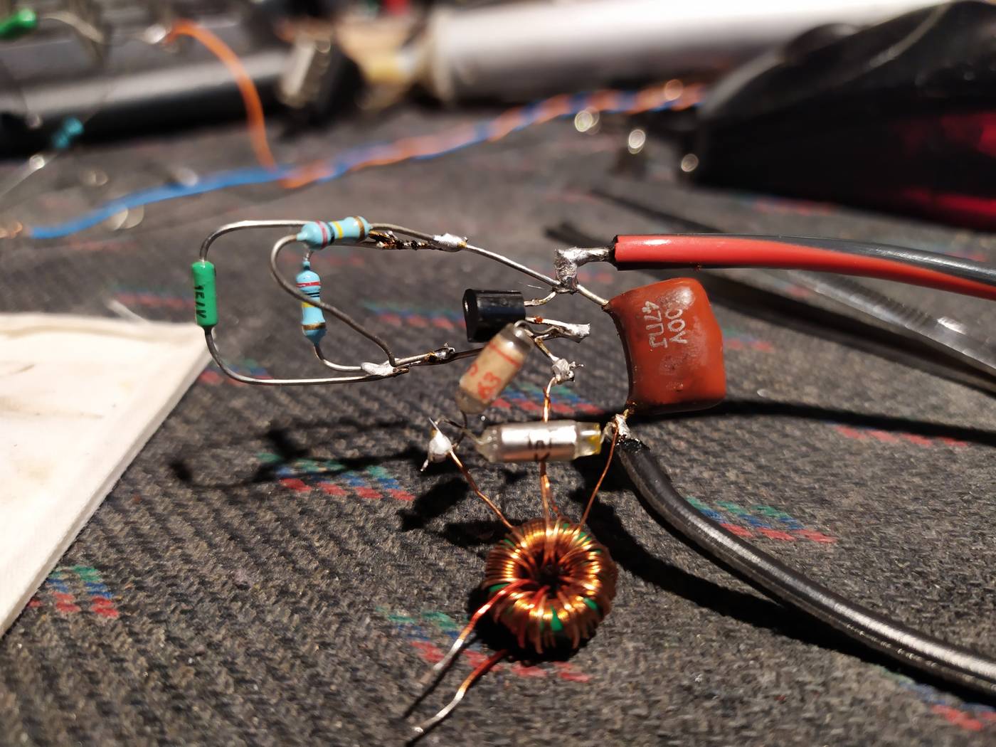 Druhá verze s nějakým "nf" toroidem cca 10/7/3 mm s vinutím 100/10/5záv 0,3 CuS. Ta kmitala naprázdno na 97 kHz, výstupní napětí 260 mV. Zatížený výstup (1 ohm) spadl na 60 mV a frekvence se zvedla na 105 kHz. Průběh ale zkreslený, jedna půlvlna dobrá, druhá silně omezená.