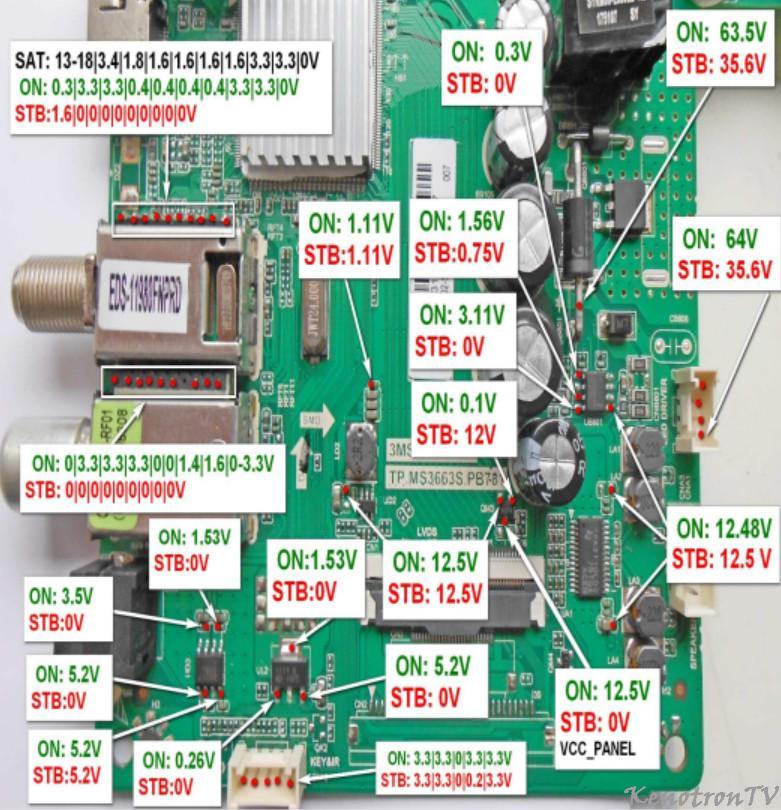 Pomeral som napätia zatial len s multimetrom, podľa fotiek, ktoré som vygooglil na Thomson T43FSE1190 a všetko nabieha vrátane core a 3,3V čo by aj sedelo tej spotrebe 4W. Ak by bola menšia povedzme pod 1W, bol by TV v stby, ale takto to vyzerá, že nie je v pohotovosti a preto je aj cpu napájaný a mierne sa hreje.