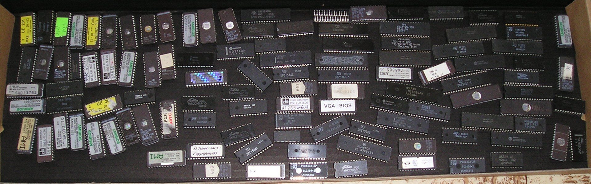 • sinclair - v krabičce jsem objevil klasické keramické EPROM, MCU I8742, 8049, 8050, MC6802 a TMS9995, CPU 8080, 8085 a 6800, SRAM 6116, 6264 a TE12512 (DIP32 úzké), periferní obvody jako 8255 aj., TTL drobotinu v malých DIL