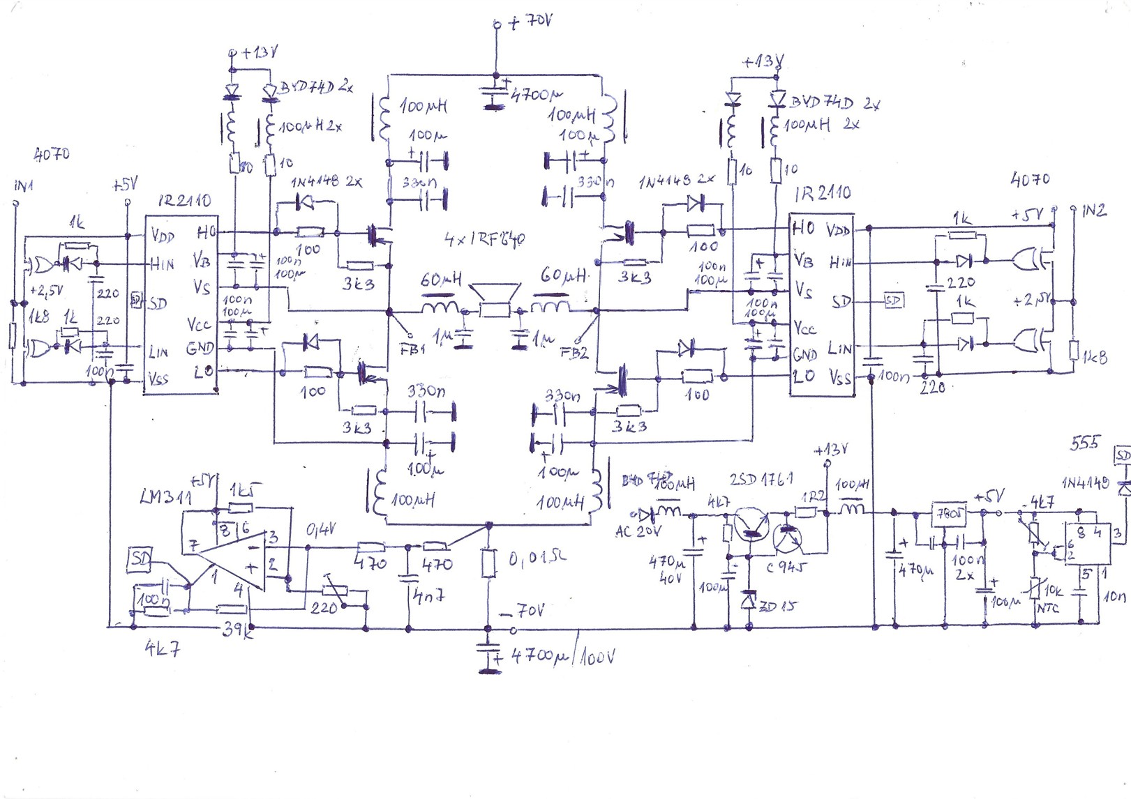 sinclair, ano, leží to tady, jsou tam KD503 serioparalelně, kvazikomplementár a buzení jsou IRF 640, ale už to dneska nemá cenu, tohle je mnohem jednodušší, na celý zesilovač je potřeba 10 PC zdrojů, z toho 4 na součástky pro zesilovač a 6 v sérii jako zdroje.