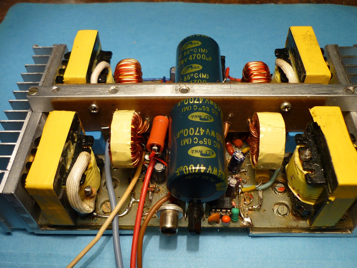 Je to zapojené do můstku a napájené z nesymetrického zdroje, proto na výstupu není kondenzátor ( 10 upravených PC zdrojů v sérii s proudovou a zkratovou ochranou) stejných, jako u toho Déčka.