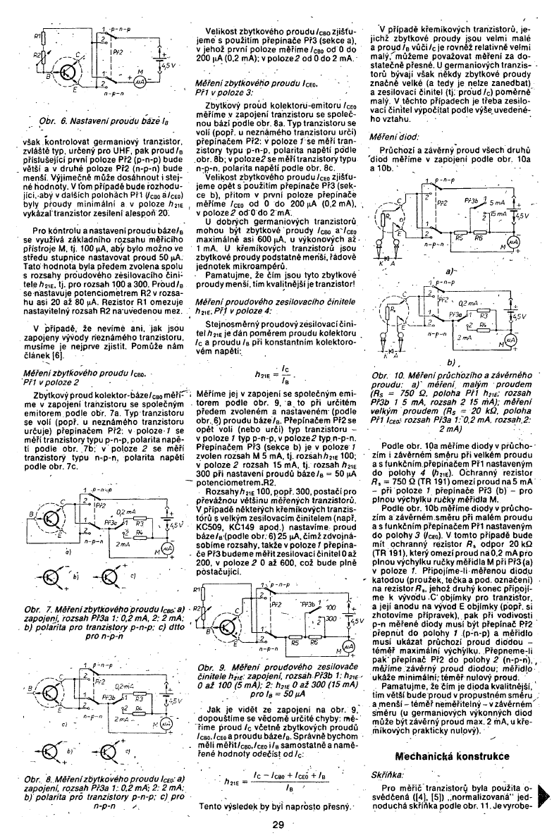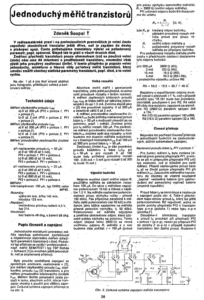 To, co popisoval Zdeněk Šoupal v RK 2/1975 jako "Voltohmtranzmetr" (přímo měření tranzistorů se týkají stránky 19 až 21) případně v Konstrukční příloze AR 1985 (str. č. 28-31) jako "Jednoduchý měřič tranzistorů" - to by se ti po doplnění digitálním modulem nelíbilo? _________________ Nasliněný prst na svorkovnici domovního rozvaděče: Jó, paninko, máte tam ty Voltíky všecky...