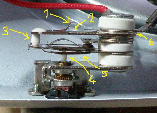 Odporový výhrevný element (1) ohrieva bimetál (2). Ten prenáša silu cez medzikus z izolantu (3) na nastaviteľne predpätý mžikový* kontakt (5). Predpätie sa nastavuje cez medzikus z izolantu (4). Izolačná podložka (6) oddeľuje jeden koniec výhrevného elementu (1) od bimetálu (2) ktorý je spojený s druhým koncom výhrevného elementu (1).