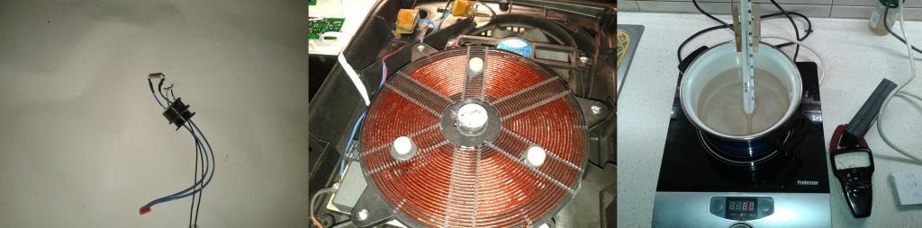 Tak mi to nedalo a dal jsem se do zkoušek. Předmětný indukční vařič jsem už před měsícem rozdělal protože fungoval jenom nad 23°C. Takže jsem mu dodělal topení a už jede. A při té příležitosti jsem si všimnul, že ve středu cívky má teplovodivou pastu přitisknutou na to varné sklo. Taky má volič teploty tak proto jsem napsal, že umí regulovat teplotu. A umí! Dneska jsem to znovu rozdělal abych se podíval co v tom středu je. Je tam tepelná pojistka na 216°C, 10A 230V. A vedle je termistor který má při 10°C 200kΩ a po nahřátí na 100°C (kontrola teploměrem) má 2kΩ. A dále prakticka zkouška.Hrnec s teploměrem a zapnuto na 60°C. Výkon si to nastavilo samo na cca1000W Jinak umí 2000W. Nahřál vodu až do varu a pak začal regulovat. Jako pomalé PWM. Teplota klesla asi na 65°C a to drží. Po zvýšení na 80 zase do varu a potom došlo k regulaci. Takže ten můj tu regulaci má. Sice trochu tupou, ale má. Jinak teplota se dá nastavit až na 240°C.