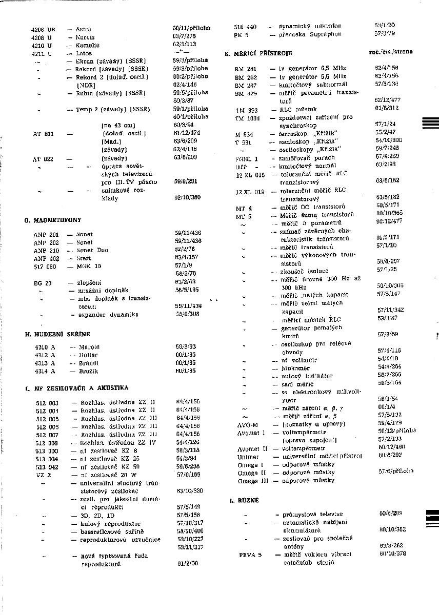 Přistroje jsou seřazeny do skupin, ve kterých jsou uspořádány podle typových čisel. U každého je uveden ročník !číslo;
