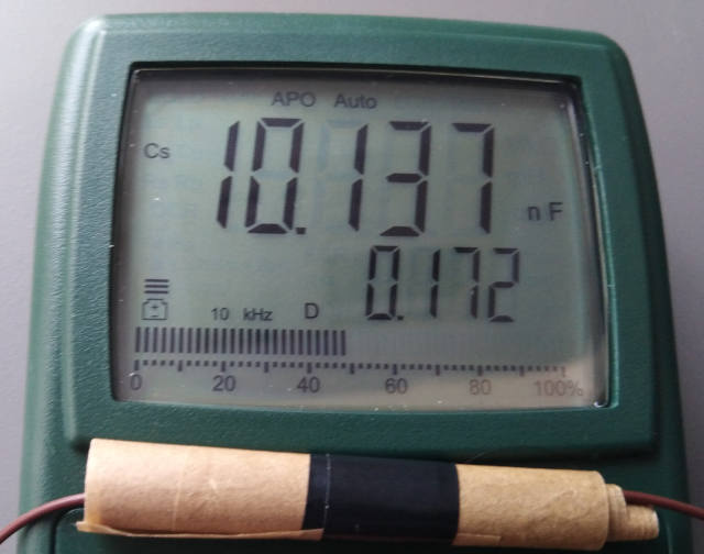 Test kondenzátoru. Změřeno přesným přístrojem 10 nF. Pečící papír asi nebude nejlepší dielektrikum, protože se prorazil už při 100V DC.