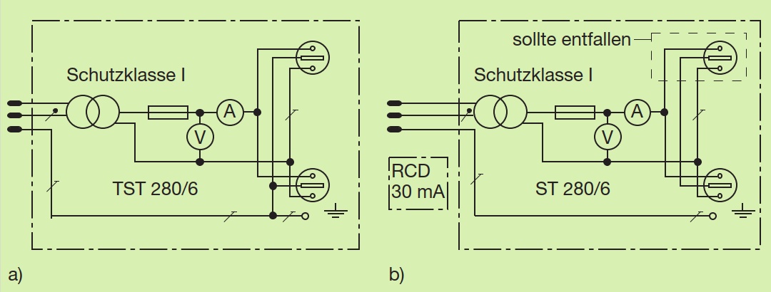 Podle tehdy platné normy TGL jde o "izolační transformátor," zařízení jako celek odpovídá třídě I. Současným požadavkům na ochranné oddělení nevyhovuje. Schéma na obrázku: a) - původní zapojení, b) - návrh úpravy.