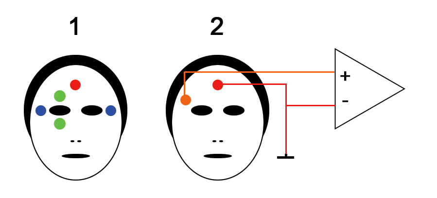 rád bych si postavil přístroj pro detekci pohybu (aktivity) očí. Nejde mi o klasický EOG detektor, jako je na obrázku u hlavy č.1. Nepotřebuji zjišťovat směr natočení očí, jde mi jen o aktivitu. Domnívám se, že by k výslednému měření mohli stačit pouze dvě elektrody, jako je na obrázku u hlavy č.2.
