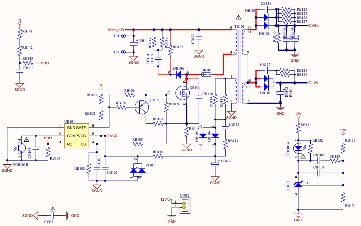 Vysoce pravděpodobně bude kaput QB102 a UB101, přerušením RB148 schytá current sense vstup napětí sítě. A taky pravděpodobně proud, co přerušil RB106 tekl do gatedriveru v UB101. Zkontroluj dobře vše mezi výkonovým mosfetem a UB101, UB101 můžeš zanapájet z laboratorního zdroje a podívat se, jestli se snaží budit gate mosfetu. Dnešní IO jsou náramně přechytřelé a pokud nenaběhne třeba current sense signál nebo zpětná vazba ze sekundáru od optočlenu, tak IO dost rychle shodí buzení, pozor na to. Kdyby přežil gatedriver a budilo to mosfet, tak to stejně každopádně zapínej přes žárovku a nejlépe ještě najíždět s napětím regulačním trafem, protože pokud bude ustřelený current sense vstup a zapneš to natvrdo, shoří to okamžitě znovu.