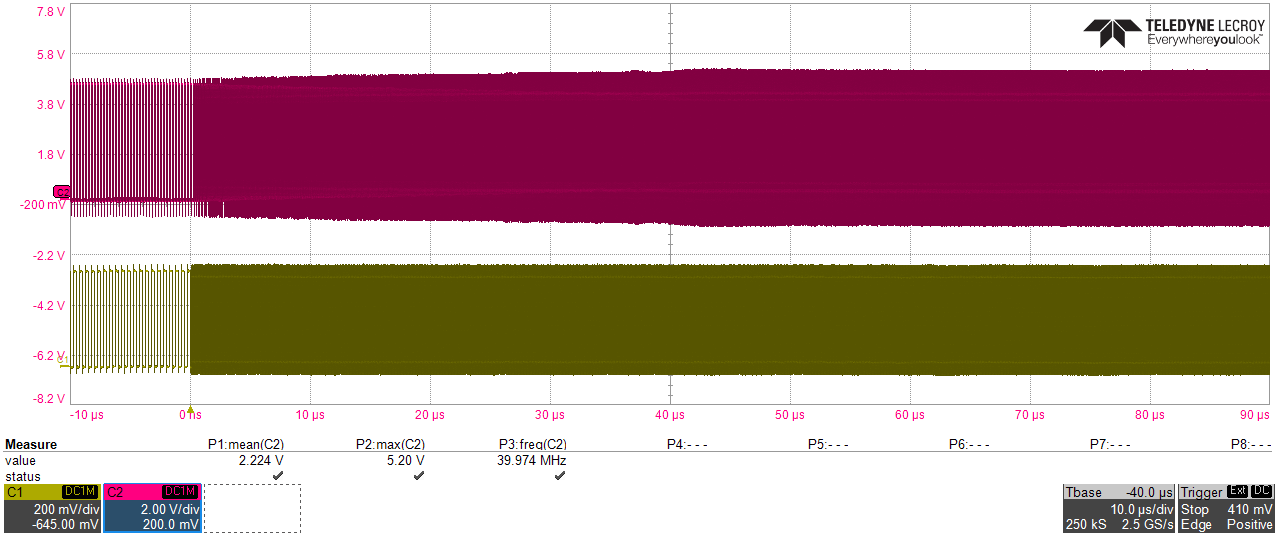 Pokud se jde se vstupním kmitočtem nahoru (žlutá křivka), výstupní kmitočet (fialová křivka) plynule stoupá dokud se ve smyčce nesrovná (po cca 40 us).