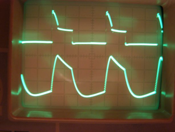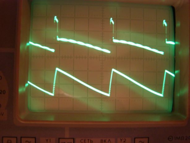 Zdravim. Mam tu problém s vertikálom u tohto staršieho TV. Je tu použitý obvod MDA1670. Po zapnutí sa cca 10 až 15 minút roztiahne obraz najmä v hornej časti. Po 10 minútach naskočí už normálne. Zdroj píly aj linearita je však OK. Problém je až na výstupe výkonového zosilňovača, čo je vidieť z priložených oscilogramov nižšie. Hore je záznam výst. napätia (10V/d) a dole je záznam prúdu, resp. napätia na snímacom odpore 1R5. (1V/d). Evidentne narastie hodnota prúdu a zdeformuje sa tvar. Vyzerá to, akoby boli širšie aj impulzy spätných behov. Nemám po ruke nový MDA1670, ani náhradný V-modul, ale pre istotu som vymenil D1 aj C6 aj C111.