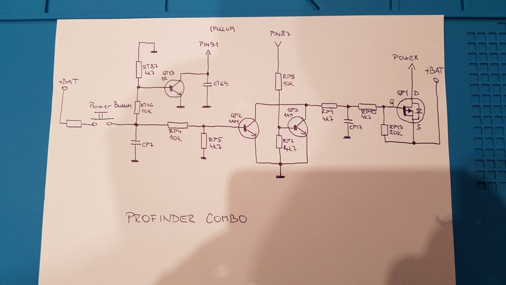 Tak sa mi to vrátilo po pol roku s tou istou závadou. Teraz pre zmenu mosfet QP1 už nespínal vôbec. Jeho gate sa správal zaujímavo - voči source mal vždy úbytok ako dióda. V testeri súčiastok sa javil nie ako mosfet, ale ako bipolar s diódou medzi C - E. Ak som spojil na DPS source s drainom, zariadenie sa zaplo. Tak som objednal mosfet. Po jeho výmene, finder bol zapnutý (mosfet otvorený), len ak som držal power tlačítko. Po jeho pustení sa ihneď vypol (mosfet sa zatvoril). Tak som si teda konečne rozkreslil schému a s ňou to už bola brnkačka Very Happy
