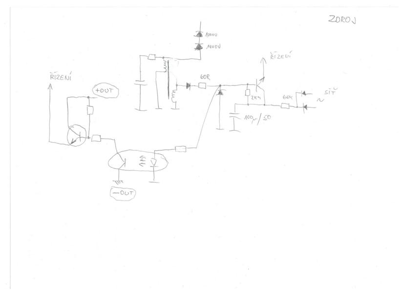 Už jsem to rozchodil. Je tam obvod, který bere napětí jednak z usměrnění sítě přes velký odpor a k tomu napětí jednocestně usměrněné napětí z jednoho vinutí trafa a to řídí přes optron něco na DC výstupní straně. Což niky neviděl a nevím proč. Druhý optron normálně reguluje napětí.