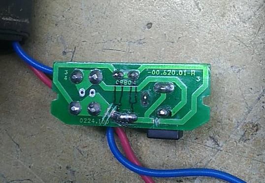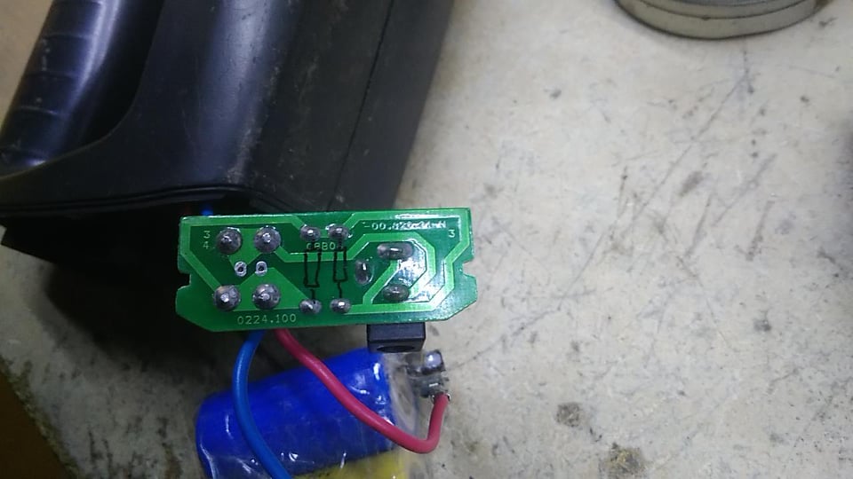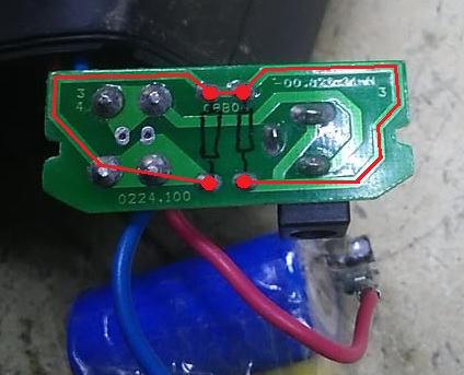 Zajímavě situovaný rezistor v nabíjecím obvodu plotových nůžek.