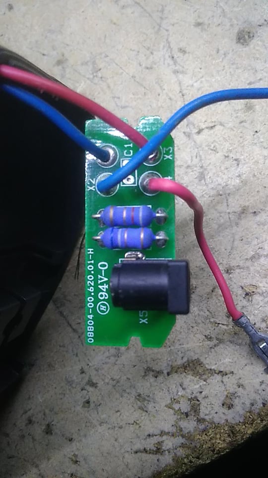 Zajímavě situovaný rezistor v nabíjecím obvodu plotových nůžek.