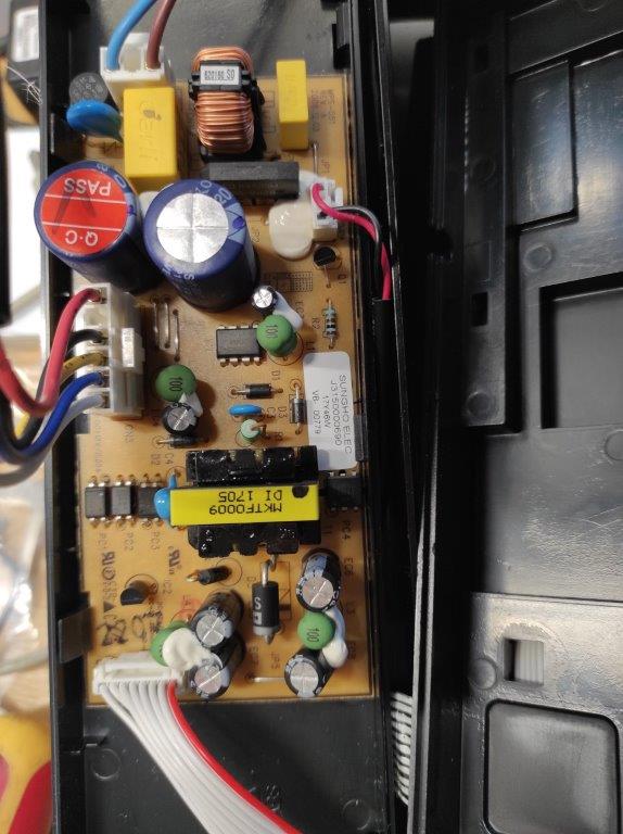 Ako prvé by som zmeral, či je medzi hnedým a svetlo modrým vodičom 230Vac a potom, či je medzi čiernym a červeným 310Vdc a medzi tým istým čiernym a žltým 15Vdc.