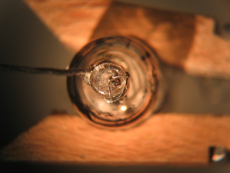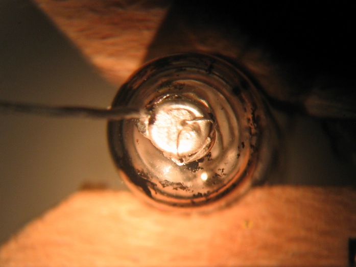 Bohužel už tam byl pokus o snad nějaké odstranění skla kolem vývodu laserem - část vršku zátavu byo sklo drsné, a stopy tavidla, jak se to někdo pokoušel pájet.