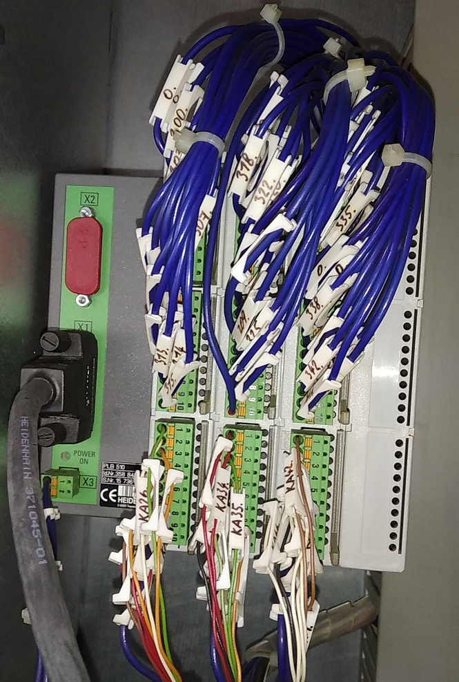 Nevím, jak je to PLC udělaný, jsem rád že přežilo zkrat a nemuselo ven a nemusela se z něj tahat ta hromada přípojnejch konektorů (viz fotka) a bádat jak a čím jsou spínaný výstupy, když to není klasickej otevřenej kolektor ale spíná se +24V "nad cívkama" relé, který mají všechna společnou nulu. Dokumentace od toho není úplná a ti co to repasovali z Tesly na Heidenhain už možná budou v penzi nebo jinde, ta fy už neexistuje.
