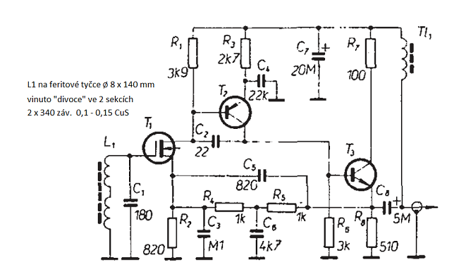 Vf lanko nemusíš shánět ani vyrábět, stačí drát CuS Ø 0,1 - 0,15 ... viz obrázek. Tato ant. jednotka z AR 10/1976 je dobrá. Jen namísto KF521 je lepší použít J310, BF245 apod. Fet. A dál (pokud chceš bastlit se staršími součástkami) jde použít přijímací část podle AR 10/1977 - má MF 500 Hz, dobrou selektivitu i citlivost, a nepotřebuje krystal.