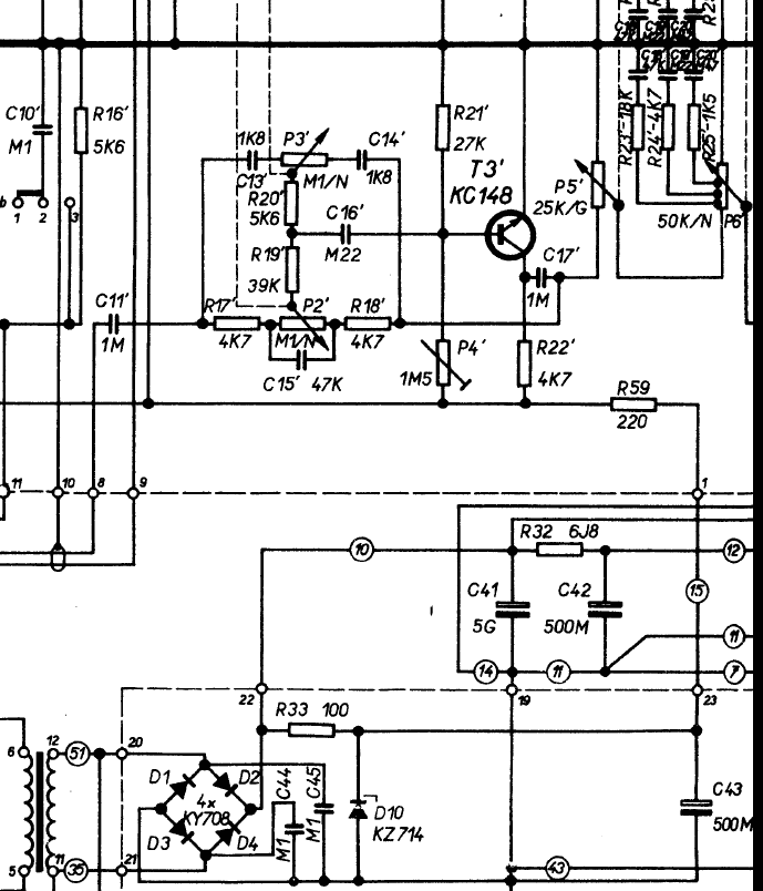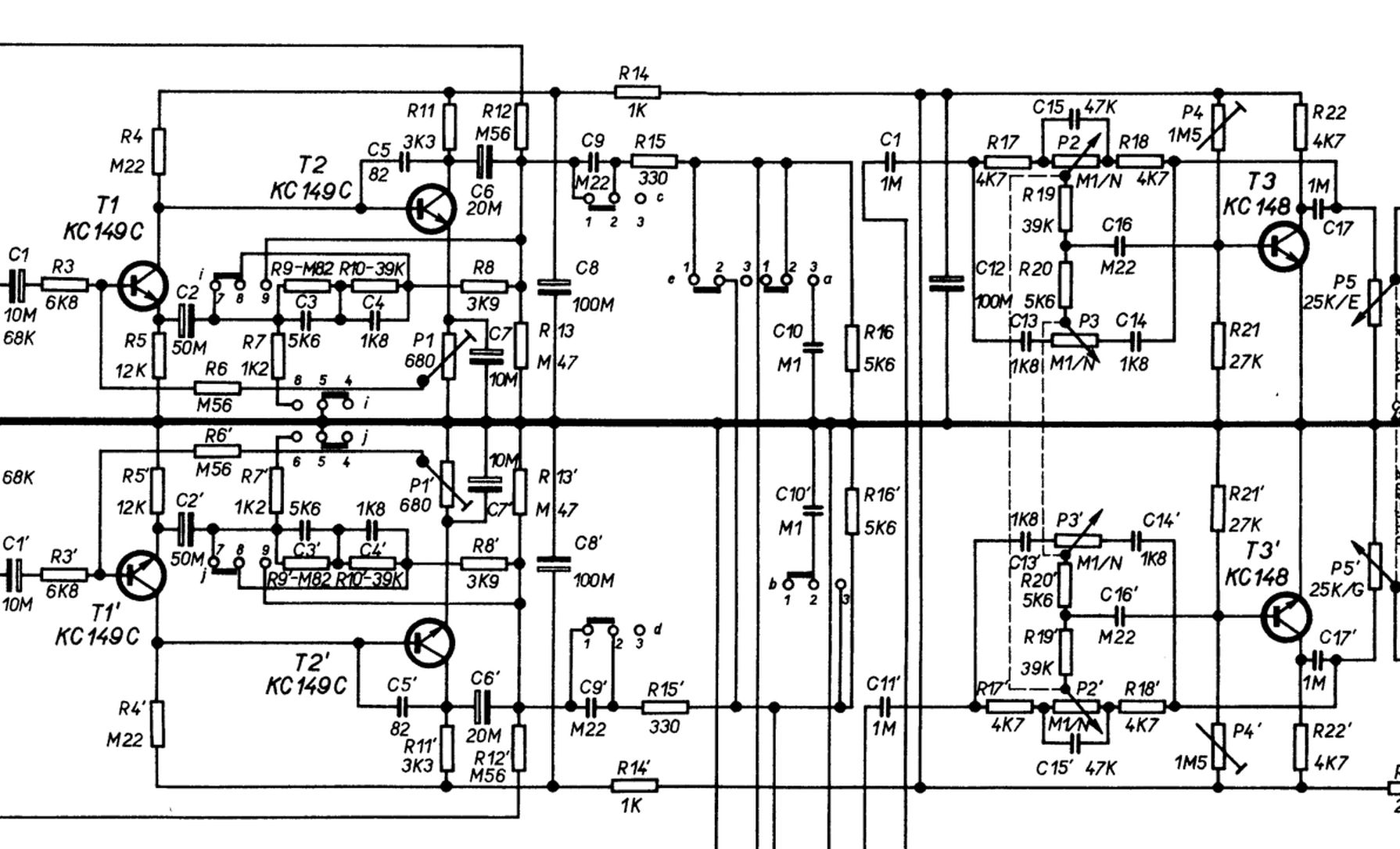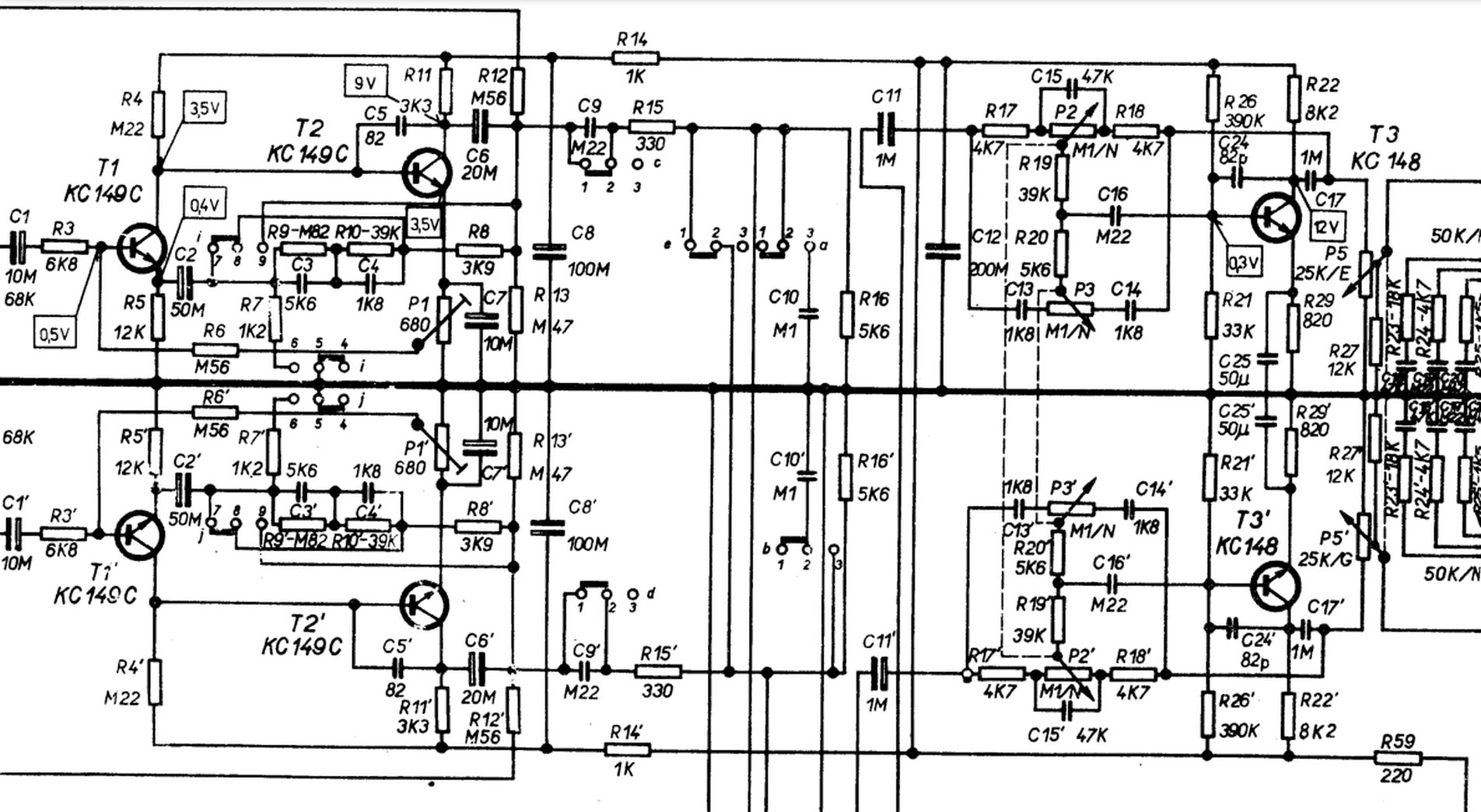 Ve většině případů nahrazuju trimry v předzesilovači a korekcích pevnými rezistory. Dost často se stane, že se trimr po podráždění rozpadne. Pokud se napětím na kolektoru T3 mění s časem má nejspíš C16 svod. Zkouším to tak, že toto napětí změřím po zapnutí, nechám gramo několik hodin zapnuté a měřím znova.