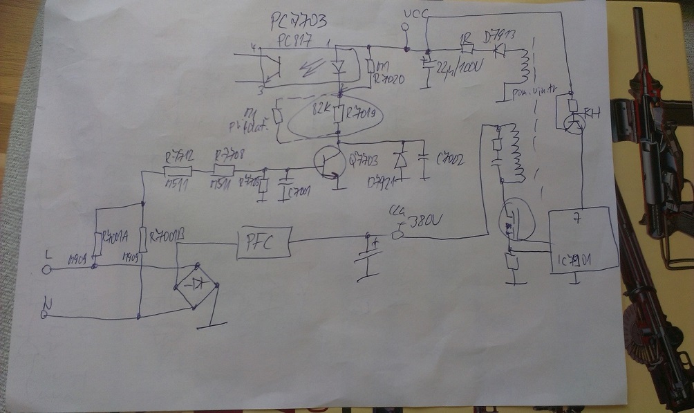 Prikladám rukou nakreslenú zjednodušenú schému obvodu s PC7703.