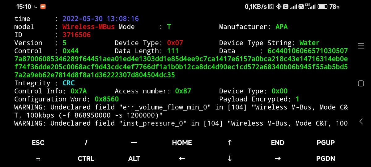 Měl jsem připravený rtl_433 a rtlamr, kde rtlamr se vůbec nechytl a až s rtl_433 jsem na frekvenci 868MHz objevil vysílání viz. obrázek. Akorát nechápu, jak se dekódují získaná data, protože jsou asi šifrovaná a navíc tam mám i nějaké varování (ale -f a -s jsem měl takto nastavené).