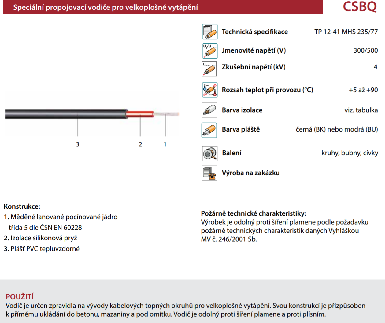 CSBQ1 - speciální propojovací vodič pro plošné vytápění. Jádro měď - pocínované lanko, izolace silikon, plášť PVC. Může se ukládat do betonu, pod omítku... odolný plísním.