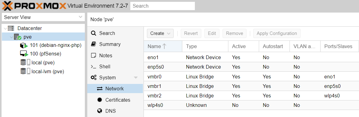 V Proxmoxu jsem přidal virtuální stroj s pfSense, který routuje/NATuje + obstarává firewall a další mám LXC kontejner s Debianem a NGINX + PHP. Ty LXC kontejnery jsou připraveny s Webminem + Adminerem, což je v prvním případě klikací nastavení, ale to ani není potřeba.