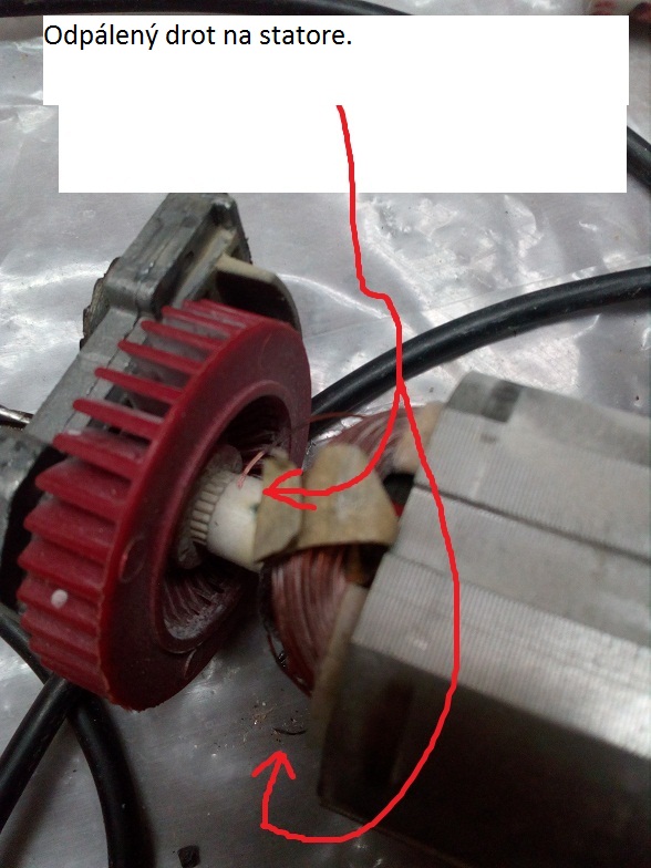 Janko, odpálený drát na statoru můžeš nastavit a spojit, to je přece jasný, ne? A zaizolovat nejlíp nějakou silikonovou bužírkou, bo je tam dost teplo. Rotor a stator jsou zapojené v sérii, tak jak spojíš ten drát, možno už pojede...