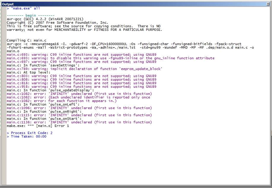 asi by som skúsil novší WinAVR, ten čo máš rozbehaný je z 2007 so starým gcc. Alebo skús upraviť v makefile riadok 125 zo -std=gnu99 na -std=c99 , i keď to je taký mačkopes trocha (gnu99 má znamenať c99 s gnu extensions) a napriek tomu, že je ten gnu99 svič na commandline, tak naň hádže fekál: "using gnu89".