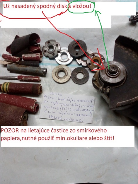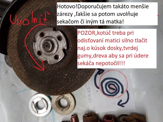 Dolezite POZOR je, ako je napisane na obrazku,pri uvolnovani matky sekacom sa musi kotuč silno pritlacit a drevo alebo gumu alebo kotuc zovret do sveraku aby sa neposkodilo ozubenie prevodovky!!!Ja to takto robim 30 rokov a ziadne zuby som preto neposkodil!!!Nepodcenujte to preto,aj ked sa nic nemusi pri uvolnovani stat!Pri velmi silnom zadreti matky je zaistenie kotuca aj ked sa znici,nevyhnutne!Ja davam aj tenky pliesok 0,5-1mm medzi kotuc a matku!!!